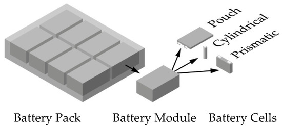 In EVs, the entire battery is often referred to as a battery pack. The battery pack typically consists of several battery modules which are comprised of individual battery cells in either a pouch, cylindrical, or prismatic cell format [26] (Figure 3).