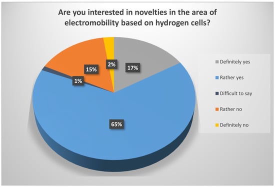 To the question: Are you interested in novelties in the area of electromobility based on hydrogen cells?—see Figure 1: almost 2/3 of the respondents answered rather yes. Next, 17% gave a definite confirming answer, which, in total, accounts for 82% of the researched sample group interested in novelties in this respect. Further, 15% of the interviewees indicated rather a lack of interest; and a definite lack of interest was expressed by only 2% of the researched sample group. The number of those who were indecisive was minimal, with 1% of the overall number of respondents. Such a distribution of answers confirmed the earlier original research stating that the group of drivers using hybrid and electric vehicles was a group with well visible preferences, as far as interest in another electromobility technology based on hydrogen cells was concerned.