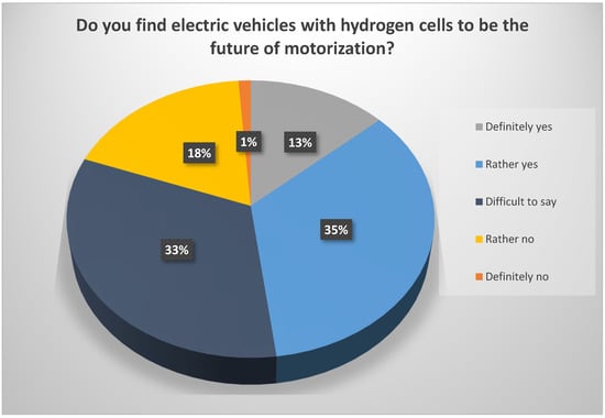 With regard to the opinion of the respondents about electric vehicles based on hydrogen cells, over 2/3 of the interviewees stated that they would be, or would rather be, the future of motorization. Less than 1/5 of the respondents had a different standpoint, and 13% did not mind this respect—see Figure 2. Here, you could see an explicit correlation between the interest in novelties concerning hydrogen cells in motorization and the conviction of their indispensable domination in the future.