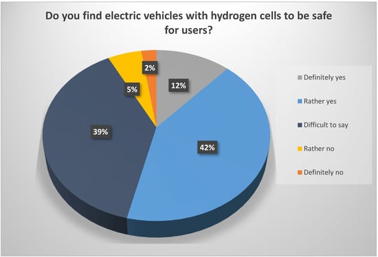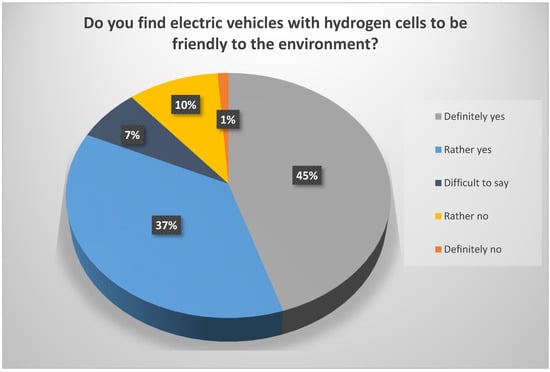 Apart from the safety of use, an increasingly significant role in the choices concerning mobility was played by the problem related to the protection of the natural environment. In this respect, in total, 82% of the interviewees indicated that electric vehicles based on hydrogen cells were definitely or rather friendly to the environment. In total, 11% of the respondents had an opposite standpoint—see Figure 3. One can assume that such a high percentage of the respondents convinced of the friendly impact of the hydrogen technology in motorization arose from the shared knowledge of modernity of the said technology and, in consequence, of its greenness.