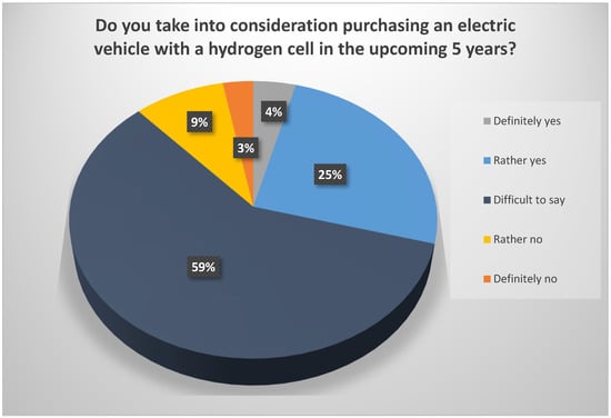 Amongst users of hybrid and electric vehicles, in Poland, there was very high uncertainty in regard to the purchase of an electric vehicle with the technology of hydrogen cells. Nearly 60% of the respondents could not express their standpoint in this respect. Only 4% of the interviewees were decided to purchase such a vehicle, and ¼ of the respondents took such a possibility into consideration. Further, 12% of the respondents did rather not take into consideration or were definitely not interested in such a purchase—see Figure 4. This distribution of answers may indicate that the hydrogen technology in motorization is still a matter that is too distant for car users, and its real commonness in the upcoming years is still small.