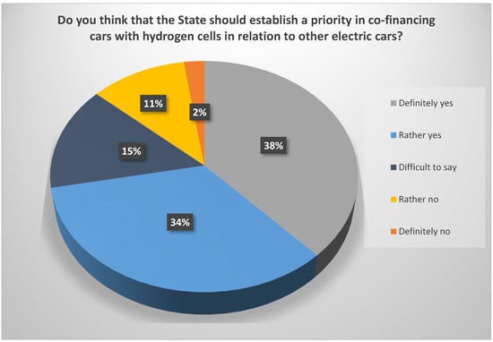 A total of 72% of the respondents thought that the State should determine co-financing the development of electromobility for cars in the hydrogen technology, in relation to other electric cars, a priority. In total, 13% of the respondents had an opposite standpoint—see Figure 6. It must be remembered that the respondents were current users of hybrid and electric vehicles, who, despite this fact, indicated the need to establish a priority in co-financing electric vehicles based on hydrogen cells.