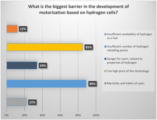 Amongst the barriers to the development of motorization in the hydrogen technology, the interviewees mainly indicated an insufficient number of hydrogen-refueling points—nearly 90% of the answers; and, again too high price of this technology—85% of the answers. More than 1/3 of the respondents paid attention to the danger for users related to the properties of hydrogen. Inaccessibility of hydrogen fuel, as well as the mentality and habits of users, were considered by the interviewees to be much less significant—see Figure 7. The answers clearly showed that to decrease the barriers to the development of electromobility based on hydrogen cells, it is necessary to ensure an appropriate infrastructure for refueling hydrogen fuel and to reduce costs of the hydrogen technology in motorization.