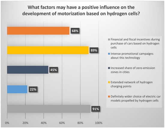 Amongst the factors, which may have a positive impact on the development of electromobility based on hydrogen cells, the respondents in more than 90% indicated financial and fiscal incentives during the purchase of cars in this technology and the extension of the networks of hydrogen charging points in 89% of the answers. By far, the broader choice of car models in this technology and an increase in zero-emission zones in the cities were also mentioned by the interviewees as essential. Respectively, 68% and 45% of the answers—see Figure 8. Again, the price and infrastructural factors turned out to be the most significant.