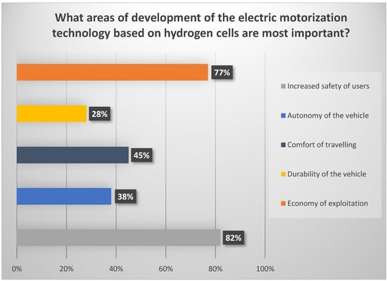 In the final issue—see Figure 10, the respondents indicated the most sensitive areas related to the development of electromobility for vehicles powered by hydrogen energy. Two areas stands out: the costs related to the operation of the vehicle and the safty of use. The least important feature was selected by the respondents as the intense promotional campaigns about the durability of the battery itself (28 % of the respodents). However, vehicle battery life can be a significant issue. Travel comfort (45% of respodents) and vehicle autonomy (38%) are classified at similar levels.