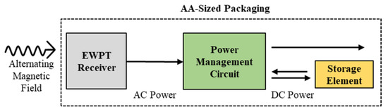 The prototype system consists of four main components: the EWPT receiver, the energy storage element, the power management circuitry (PMC), and the AA-sized mechanical packaging (Figure 1). For wireless charging, the EWPT receiver is excited by an external time-varying magnetic field and generates an ac voltage and current. These ac signals are rectified and stabilized into a constant dc signal within the PMC, and these rectified signals are used to charge the energy storage element. The AA-sized packaging encloses the other components and has metal endcaps that connect the system to the external load. When an external load is connected, the PMC withdraws power from the energy storage element and delivers it to the load. Figure 2 shows a block diagram of the overall system and each block is defined below.