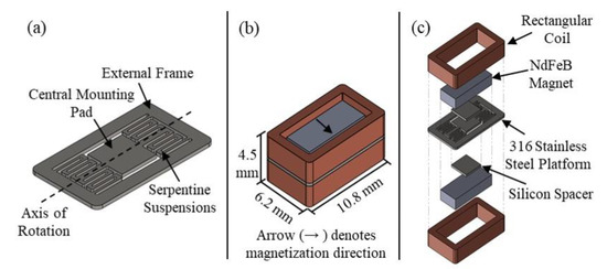 The EWPT receiver consists of four main components: a 316 stainless steel platform, two silicon spacers, two rectangular neodymium (NdFeB) magnets, and two rectangular coils. At the center of the EWPT receiver design is the laser-machined steel suspension, which consists of a torsionally resonated mounting pad with two serpentine suspensions connecting the mounting pad to an external frame (Figure 3a). Two silicon spacers are located on each side of the central mounting pad, and a rectangular magnet (magnetized along its width) is located on top of each spacer. Two rectangular coils, electrically connected in series, are attached to the external frame, effectively surrounding the magnet. These coils are precision-manufactured with 44 AWG laminated copper wire, with 498 turns and a total electrical resistance of 125 Ω. Figure 3b,c depicts the completed EWPT receiver assembly, as well as an exploded view. The design uses a 0.1 mm-thick, 316 stainless steel platform, whereas a previously reported receiver [20,21] used a 0.3 mm-thick silicon platform; 316 stainless steel is used for its relatively high yield and ultimate strength, as well as it being a non-magnetic class of stainless steel.