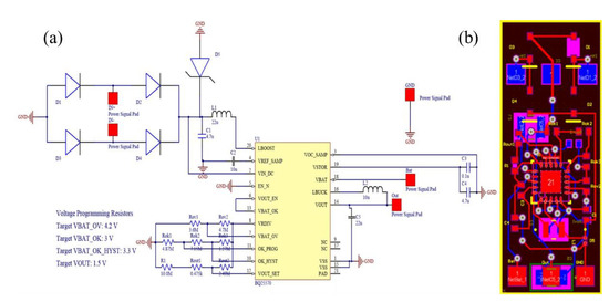 (a) Circuit diagram of the PMC and (b) its schematic layout on a 2-layer PCB.