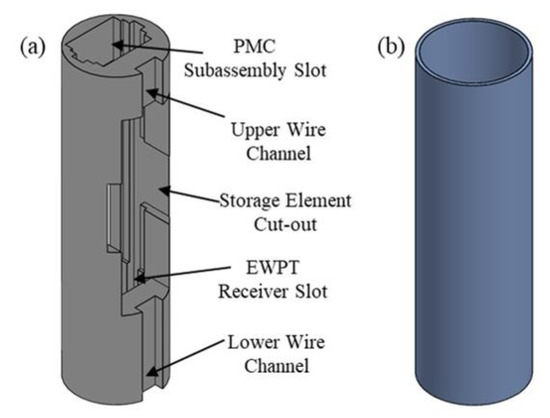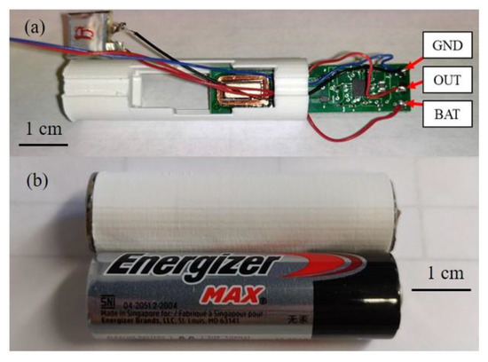 To assemble the AA-sized prototype, the PMC board (with the EWPT receiver attached) was inserted into the 3D-printed internal structure. The orientation of the PMC/EWPT receiver subassembly is displayed in Figure 7a. The storage element was soldered to the battery charging terminals on the PMC, with the positive lead attached to the “BAT” terminal and the negative lead grounded. Two jumper wires were attached to the load terminals of the PMC, with one on the “OUT” terminal and the other to the common ground. Next, the storage element was placed within its designated cut-out on the internal structure, and then the outer casing was slid over the structure. The jumper wire attached to the “OUT” terminal was soldered to the positive end cap and the other jumper wire was soldered to the negative end-cap. Lastly, each end cap was glued to each end of the outer casing, completing the overall assembly (Figure 7b).
