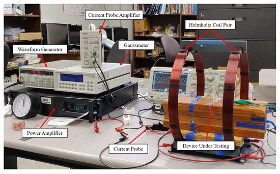 The experimental setup for each test required a transmitter system to generate a time-varying magnetic field (Figure 8). This alternating magnetic field was generated using a Helmholtz coil pair (1000906 3B Scientific, Hamburg, Germany; 124 turns per coil; 300 mm outer diameter; 150 mm coil separation). An ac signal was generated by a waveform generator (DG1022A Rigol, Beaverton, OR, USA) and was fed into a power amplifier (K1 Crown, Los Angeles, CA, USA). The amplified ac signal was fed into the Helmholtz coil pair. The amplitude of magnetic field was linearly dependent on the amplitude of the current supplied to the coil. Initially, the magnetic field strength was measured directly with a gaussmeter (475DSP Lake Shore Cryotronics Inc., Westerville, OH, USA) connected to a transverse Hall probe (XHMMA-1482 Lake Shore Cryotronics Inc., Westerville, OH, USA) placed at the center of the Helmholtz coil pair. However, by using a current probe (TCP312A Tektronix, Beaverton, OR, USA) and a current probe amplifier (TCPA300 Tektronix, Beaverton, OR, USA), a calibration curve was generated to estimate the field strengths based on the supplied current amplitude. Lastly, a digital storage oscilloscope (DPO-2004 B Tektronix, Beaverton, OR, USA) was used to measure current and voltage waveforms for various inputs and outputs. Because the overall goal was to determine the low-end performance of the AA-sized prototype and its components, the transmitter system was used only to produce a low magnetic field strength of 50 µTrms; only slightly stronger than Earth’s magnetic field (on the surface). For magnetic fields with frequencies below 1 kHz, the maximum allowable (IEEE safety regulations) field strengths are 2.71 mTrms for controlled environments and 0.904 mTrms for the general public [12].
