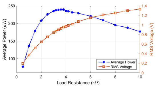 By plotting the calculated average power versus the load resistance, the maximum power and its corresponding resistive load value were determined (Figure 10). For the EWPT receiver, the optimum resistive load was 3.8 kΩ, which produced a load voltage of 954 mVrms and, thus, a maximum power of 240 µW. Although 3.8 kΩ was the optimum resistive load, we observed that the generated power was relatively constant, between 3.0 kΩ and 4.0 kΩ.