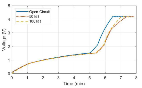 The effectiveness tests were performed with a 50 kΩ load, a 100 kΩ load, and no load (open circuit) connected to the output terminals of the PMC. For each resistive load, a curve fit was performed over the capacitor voltage measurements (Figure 11). The shape of the voltage curve was dependent on the task the BQ25570 chip was performing. The initial region was a slow-growing polynomial that converged to approximately 1.5 V. After the capacitor reached 1.5 V, the voltage grew much faster, with some fluctuations occurring due to the cold start process of the BQ25570 chip. The next major change occurred once the capacitor reached 3.3 V, as this was the programmed starting point for the PMC board to start outputting 1.5 V to the attached load. The final region occurred after the capacitor reached 4.2 V and began cyclically charging and discharging around 4.2 V. Lastly, the minimum load required for the PMC to charge the capacitor was found to be 23 kΩ. At this load, the capacitor would not charge beyond 3.3 V, as the 1.5 V output terminals were draining the capacitor at the same rate it was being charged.