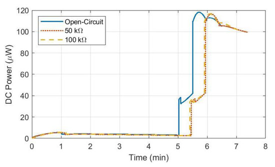 The current to the capacitor was determined by curve fitting a numerical approximation to the voltage curves and taking their derivative. With the approximated current, the dc power curves for each resistive load were generated (Figure 12). The power effectiveness for each case was then calculated. Table 1 summarizes the results. A final power calculation was performed to calculate the power supplied to the transmitter system. This average power was calculated as 19.1 mW, which resulted in an end-to-end power transfer efficiency (PTE) for the overall system that was less than 1%. This efficiency is arguably quite low, but not unexpected, since the system characterization is performed near the minimal operating point of the electronics. Additionally, system efficiency can be significantly improved via further design optimizations of the transmitter, EWPT receiver, and the receiver PMC.
