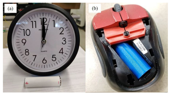 (a) Prototype in front of the battery powered clock and, (b) prototype installed within a wireless computer mouse (different 3D printed package but identical internals).