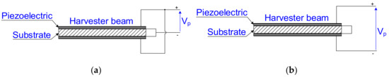 The beam structure is made by gluing the piezoelectric material to one side (unimorph) [1,9] or both sides (bimorph) [2,10] of the carrying substrate. Two piezoelectric layers, which are glued on both sides of the substrate, may be electrically parallel or series connected [11,12,13]. Schemata of parallel and series connection of two piezoelectric layers, each of which is equipped with two electrodes, are presented in Figure 1.