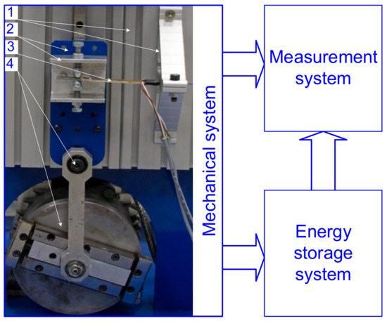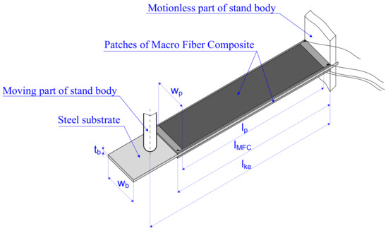 Experiments were conducted in laboratory setup and consisted of three main parts: mechanical system, energy storage system and measurement system (Figure 2). The mechanical system contained a motionless part of the stand body (1), moving part of the stand body (2), slider crank mechanism (4) and tested bimorph (3). A sinusoidal displacement of the moving part of the body was generated by slider crank mechanism. Amplitude and frequency of the sinusoidal displacement could be changed during laboratory research. One (fixed) tip of the tested bimorph was mounted to the motionless part of the stand body. Displacement of the second (moved) tip of the beam was extorted by the moving part of the stand body. The manufactured bimorph had a prismatic shape with a rectangular cross-section. The beam structure consisted of a carrying substrate and two patches of Macro Fiber Composite of P2 type, which were glued on both sides of the carrying substrate (Figure 3). The carrying substrate was made from steel.