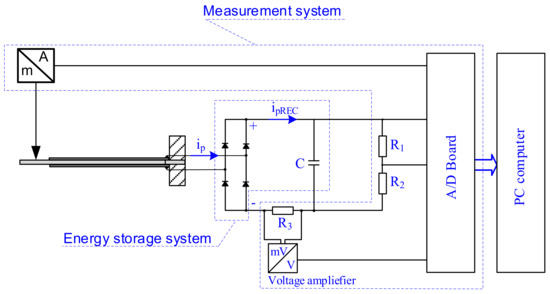The energy storage system (Figure 4) consisted of two components: Graetz bridge and capacitor. Such a system is called a standard energy harvesting circuit (SEH) and is used for capacitor charging [26]. The measurement system (Figure 4) consisted of three main components: A/D Board (DaqBoard 2000-CH4), voltage amplifier (ADAM 3016) and laser sensor of displacement. Three quantities were measured during laboratory experiments: rectified voltage, voltage across the capacitor and displacement of the moved tip of the harvester beam. Input impedance of measurement instruments was equal to 300 kΩ.