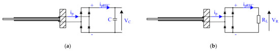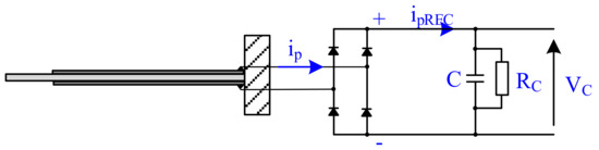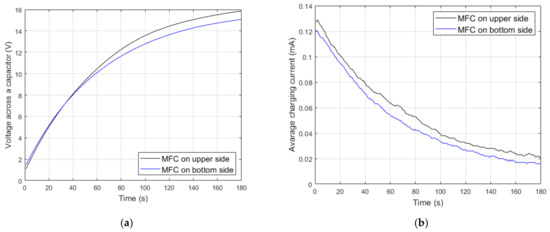 The capacitor was not effectively charged by the use of parallel 2 connection (Figure 9b) and series 2 connection (Figure 9d). Prospective values of voltage across the capacitor and charging current for series 2 connection and parallel 2 connection were equal to zero, because the voltage generated by one MFC patch was subtracted from the voltage generated by the second MFC patch for series 2 connection and the current generated by one MFC patch was subtracted from the current generated by the second MFC patch for parallel 2 connection. However, voltage across the capacitor and charging current for series 2 connection and parallel 2 connection was different from zero in laboratory experiments. Different thicknesses of bonding layers between the substrate and the particular MFC patch may be the cause of such results. The impact of voltage losses (0.7 V) in Graetz bridge diodes may be the cause of an insignificantly larger voltage across the capacitor obtained for series 2 connection of MFC patches in comparison to the voltage obtained for parallel 2 connection. The voltage produced by series 2 connection was larger than the voltage produced by parallel 2 connection; hence, voltage losses in diodes had a smaller impact on series 2 connection in comparison to parallel 2 connection.