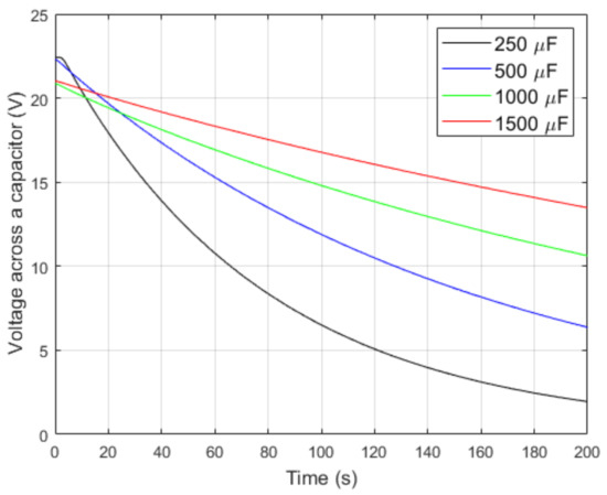 The charging of four capacitors to about 20 V and discharging of these capacitors was realized in the first stage. Capacitors with capacitances of 250 µF, 500 µF, 1000 µF and 1500 µF were used in laboratory research. Capacitors were charged by the bimorph presented in Figure 3. The courses of voltage across tested capacitors for the discharging process are presented in Figure 6. The equivalent resistance Req for both the storage system and measurement system was calculated on the basis of Equation (1). [27]