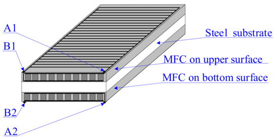 The bimorph contained two MFC patches which were glued on the upper and bottom surface of a steel substrate. Each commercial MFC patch is equipped with two points to which electrodes are connected. In laboratory experiments, these points were marked as follows (Figure 8):