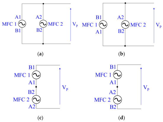 Connections of two MFC patches in bimorph: (a) parallel 1; (b) parallel 2; (c) series 1; (d) series 2.