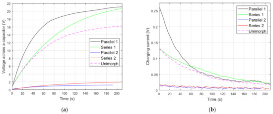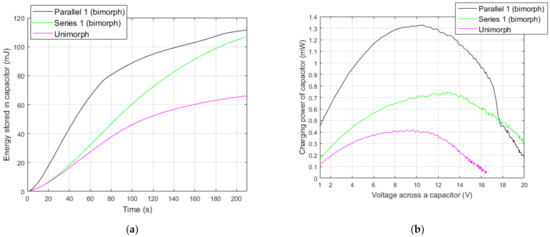 The capacitor was effectively charged both by the bimorph with a parallel 1 connection and with a series 1 connection. In the next step, both energy stored in the capacitor and the charging power of the capacitor were calculated for a parallel 1 connection and series 1 connection on the basis of voltage across the capacitor presented in Figure 10a. Results for the bimorph were compared with energy stored in the capacitor and the charging power of the capacitor for a unimorph containing one MFC patch glued on the upper surface of the substrate. Energies and charging powers are presented in Figure 11.