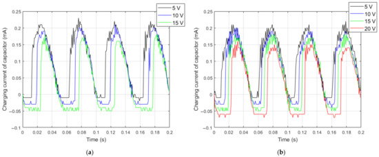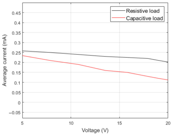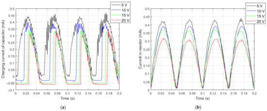 Comparison between average values of rectified current for the resistive load and average values of the charging current of the capacitor are presented in Figure 14. It should be noted that the difference between these average values of current increased when the voltage increased.