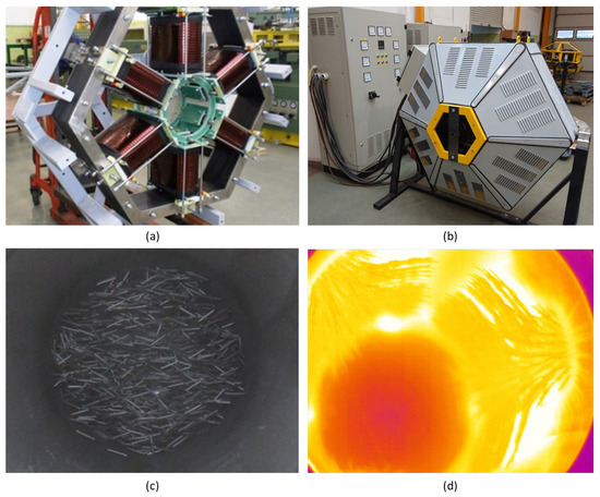 Electromagnetic mill D200: (a) inductor; (b) mill on the test stand without the working chamber; (c) ferromagnetic rods (grinding medium) moving inside the working chamber; (d) grinding medium during stop procedure arranging according to the pole lines (thermo-vision image).