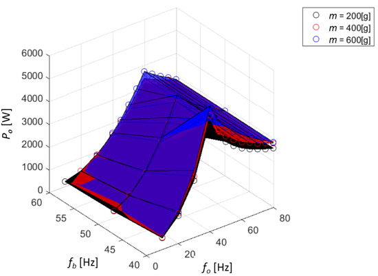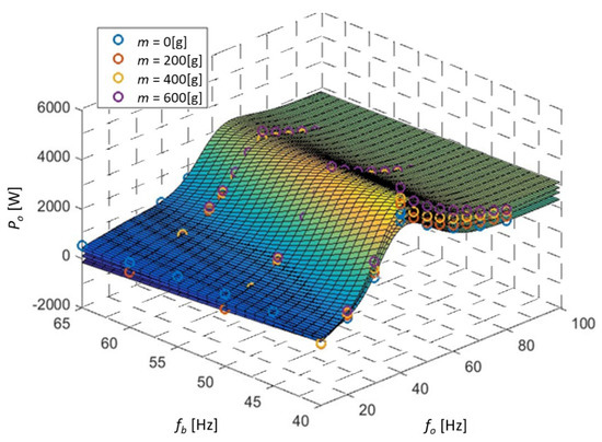 Figure 9 shows the measured values of active power Po (represented by the empty circles on the chart), registered by the SCADA system for different set points of base and output frequencies, fb and fo, respectively, and for different mass of grinding medium inside the working chamber m. Based on the measurements models approximating the active power Po were identified for each value of the grinding medium mass m separately. The models were designed as a two-layered ANN with 10 neurons in the hidden layer. Each surface in Figure 9 represents the simulation results for each model separately (e.g., the surface indicating the lowest values of active power is the result of simulation for the model identified for m = 0 g, while the surface indicating the highest values of active power is the result of simulations for model obtained for m = 600 g). Figure 9 shows that for a fixed value of the base frequency fb, there is only one extremum (maximum) of active power for the output frequency fo equal to the base frequency fb. Additionally, in the direction parallel to the base frequency axis fb, the static characteristic is monotonic and decreases with increasing value of the base frequency fb. Therefore, the assumption about unimodality of the static active power characteristic, which is also the objective function of the optimization task J(fo, fb) is met.