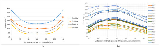 To better illustrate the uniform distribution of induction, it can be presented along a line between opposite poles at an equal distance from the bottom and top of the working chamber (for Dx = 0) (Figure 6a) or along a line parallel to the z axis (or the side edge of the working chamber) (Figure 6b). Figure 6a shows the induction values for fb = 50 Hz and fo = [40,50,60,70] Hz. Figure 6b shows the measurement results for fb = fo = 50 Hz and the respective curves correspond to the points on the cross-section of the working chamber. Exemplary values of the measured induction and respective current Io, as in Figure 6a, are presented in Table 1.