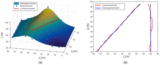 Due to lack of an upper limit on the induction, only the lower limit (12) is valid. Maintaining the limitation (12) requires the determination of the magnetic induction inside the working chamber during the grinding process. It is, howeverr, impossible, because while working, the chamber is filled with grinding medium and material (see Figure 1c). An indirect method should then be used based on the linear relation of induction B and the current Io (see Figure 7). Experimental static characteristic of the current was made depending on the output frequency fo and the base frequency fb for empty working chamber. For the approximation purposes, a two-layer neural network with one hidden layer was used. The two-layer network allows for a more precise approximation of non-linear characteristic [39] then a single-layer variant. To ensure a sufficiently accurate and smooth approximation, a structure with seven neurons in the hidden layer was finally used. The neural network approximator allows to determine the segment where current Io reaches a given value. The experiments with several different materials showed that if the current is greater than 55 A, the limitation of the lower value of the magnetic induction Bmin (12) is kept. The current measurements, as well as the result of the characteristic approximation using ANN and the current limitation, are shown in Figure 8a. The approximation result using linear function of the lower current limitation is shown in Figure 8b.