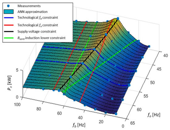 The coefficients in (14) are parameters of the optimization problem determined by the supervisory control layer for a given operating point of the technological system. The example presented in (14) concerns the D100 mill, product quality (expressed with 80% of product grains with a size <50 µm) and the process efficiency of 150 kg/h of the processed copper ore. Constraints (14) are graphically presented on the active power static characteristic in Figure 10 to indicate the area where optimum solution will satisfy the constraints. Figure 10 combines the active power measurements (dots) and measurements approximation using the ANN model (surface) with graphical representation of constraints (14). Contrary to Figure 9, it presents only one case of the grinding medium mass (m = 200 g) for clarity. Each line in Figure 10 represents the borders of the allowed area indicated by each constraint, e.g., the area between two red lines (including the lines) represents the region where technological constraints on fo are respected, while the area between two green lines concerns lower limit on Bcentr. Supply voltage requirements, described by only one constraint in (14) are respected in the region on the right side of the black line, representing this constraint. The intersection of all such regions in Figure 10 represents the search area for the optimization task.