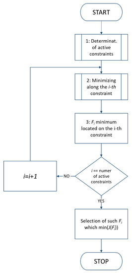 The general outline of the optimization algorithm is presented in the diagram below (Figure 11). The algorithm starts with determining the active constraints (segments ) of the optimization problem. Then, the minimum active power is searched for each segment . The minimum value is stored together with the value of decision variables for which it was obtained. After minimization for each active constraint, the lowest value is selected.