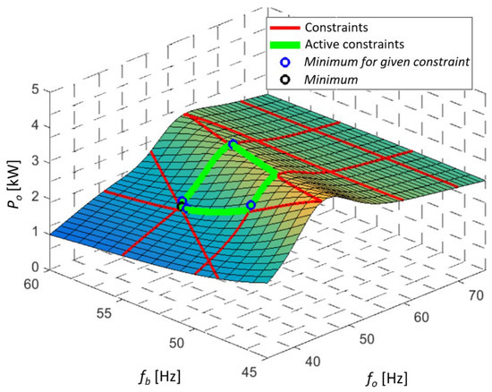 It can be seen that with each iteration of the golden section method, the decision variables tend to the minimum value of each constraint, narrowing the segment . Finally, a minimum is determined for each constraint (Figure 13) and the lowest value is selected. The starting point for the simulated optimization task is the set of nominal frequencies fo = fb = 50 Hz resulting in the active power Po value over 3.6 kW. As Figure 13 shows, the optimization algorithms is calculating the lowest values of the objective function (equal to active power) for each of the active constraints (blue circles). Then, the overall minimum is chosen from all solution candidates (black circle) resulting in the active power reduction to almost 2.1 kW that stands for almost 42% of the power reduction. As follows from the analysis of the objective function model in Figure 13, further reduction of active power is possible, e.g., for lower values of fo. It would, however, lead to the violation of the imposed technological and quality constraints, hence only the allowed area inside the constrained region can be considered.