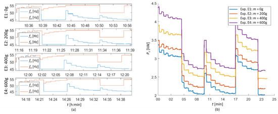 As part of many tests, four experiments E1 to E4 were carried out, in which a mass of grinding medium mk = [0,200,400,600] g was checked. Figure 14 summarizes the time series of these experiments: the range of changes in the base and output frequencies and the change in active power of the mill.