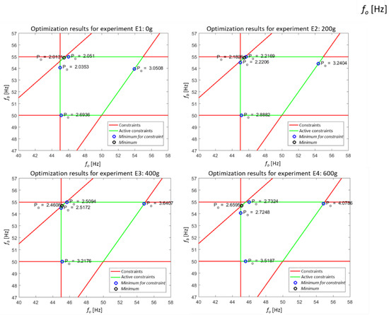 Analysis of the results shows that for each of the active constraints, the method determines the minimum of the objective function and then selects the one for which this value is the lowest. The results of the algorithm for four experiments are presented in Figure 15. For each operating point, the method determined the values of the fb and fo frequencies, minimizing the energy consumption, which each time is lower by approximately 40% than the value obtained for the nominal settings fb = 50 Hz and fo = 50 Hz (compare Figure 14b).