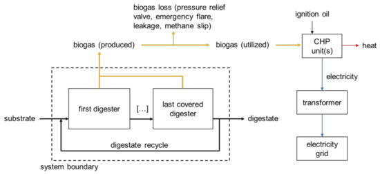 System boundary for efficiency assessment; starting with the first digester and ending with the last covered digester (CHP—combined heat and power plant).