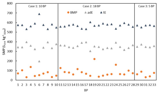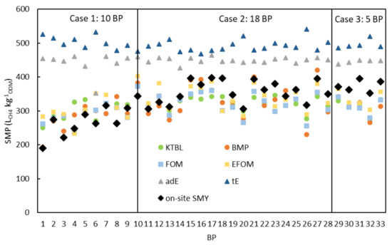 The specific methane potentials (SMP) from substrate mixtures of 33 biogas plants (BP) in Figure 3 were determined by literature values of Association for Technology and Structures in Agriculture (KTBL), biochemical methane potential test (BMP), fermentable organic matter (FOM), energy of fermentable organic matter (EFOM), anaerobically degradable energy (adE), total energy (tE) and the on-site measured methane yield (on-site SMY). SMPKTBL,SM, SMPBMP,SM, SMPFOM,SM and SMPEFOM,SM show similar tendency for the specific methane potential between the BPs (Figure 3). The tendency is also similar to the on-site SMY, which is the specific methane yield of the fed substrate mixtures. This indicates a good sensitivity of the methods. However, SMPKTBL,SM, SMPBMP,SM, SMPFOM,SM and SMPEFOM,SM are mostly lower compared to the on-site SMY. The main reason is an underestimation of the potential by the methods, as discussed later. Another possible reason, like false process data, is only a possibility for 5 of 33 BPs (Case 3, Figure 3), by underestimation of the fed substrate mass and/or underestimation of CHP unit efficiency.