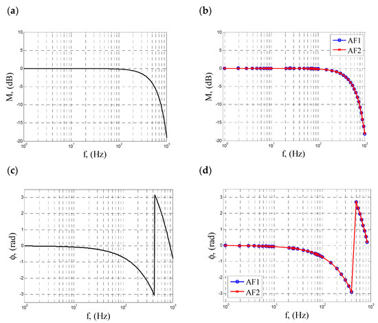 Frequency characteristics of the amplitude (a,b) and phases (c,d) of analog filters used in voltage measuring paths (AF1) and in the stator current measuring paths (AF2) of the roadheader’s cutterhead driving motor; (a,c) theoretical characteristics, (b,d) empirical characteristics.