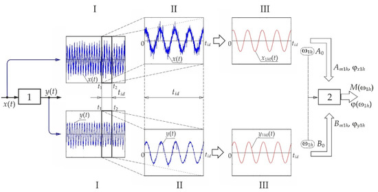 - Determination of Mf(ω1h) and φf(ω1h) based on the identified signal’s first harmonic at the tested filter input and output, for different pulsations (frequencies) (2—Figure 4)