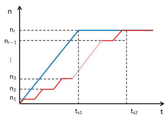 The driving motor of a roadheader’s cutterhead is usually started with no load. In industrial conditions, when the motor is powered by a frequency converter, the process can be used to record the signals necessary for the assessment of analog filters operating in the measuring paths of electrical quantities. This requires the conversion of the linear increase of the motor rotational speed during the start-up, with a smooth increase of the supply voltage frequency from the minimum one to near to the rated one, into a trapezoidal waveform, as shown in Figure 5. The trapezoidal increase in motor rotational speed during its start-up in idle mode enables the steady states for selected frequencies of the supply voltage to be obtained. The signals measured in the current and voltage measuring paths at the input and output of the appropriate filters can be used to determine the selected points of their frequency characteristics (using the method described in Item 3). This is to assess the performance of the tested analog filters after a specified period of operation without removing them from the measuring system.