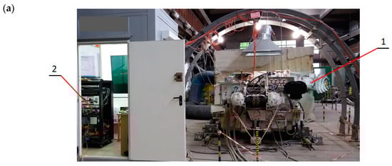 Stand for testing the converter drive system of the roadheader’s cutterhead; (a) view of the stand, (b) block diagram of the measuring system used during the measurements aimed at evaluating the analog filters’ performance; 1—roadheader, 2—stand for control and measurements of electrical and mechanical parameters of a roadheader with an analog filter system.