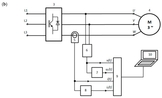 The suggested method was used to evaluate the operation of analog filters in two measuring paths: the voltage at the output of the frequency converter and the stator current of the motor driving the roadheader’s cutterhead. A schematic diagram of the system for recording the required signals during the measurements is presented in Figure 6.