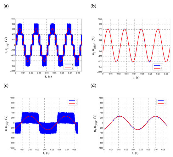 Estimated waveforms of the fundamental harmonic of the voltage supplying the motor against the background of the measuring signal at the input (a,c) and the output of the analog filter (b,d) with the frequencies (a,b) 47.59 Hz and (c,d) 20.64 Hz; 1—measurement data, 2—identified voltage fundamental harmonic.