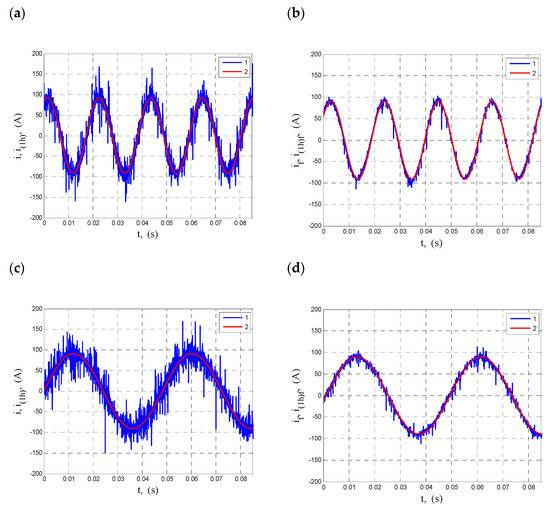 Estimated waveforms of the fundamental harmonic of the motor’s stator current against the background of the measuring signal at the input (a,c) and the output of the analog filter (b,d) with the frequencies (a,b) 47.61 Hz and (c,d) 20.67 Hz; 1—measurement data, 2—identified current fundamental harmonic.