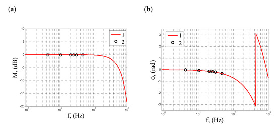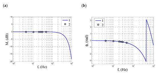 Points of the frequency characteristics of the (a) amplitude and (b) phase of the tested analog filter used in the measuring line of the voltage supplying the motor, determined by the suggested method, against the theoretical Bodé characteristics of this filter; 1—theoretical frequency characteristics of the filter, 2—results of the suggested method.