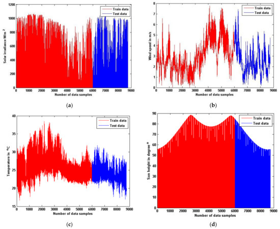 Training and testing sample dataset of environmental parameters: (a) Solar radiation; (b) Wind speed; (c) Ambient temperature of the location; (d) Sun elevation.