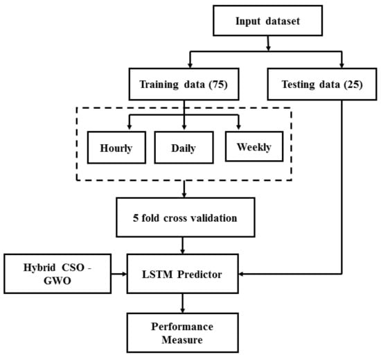 The proposed methodology is about approximating the hourly data for daily and weekly forecasting. With the available hourly dataset, the authors tried to perform daily and weekly forecasting based on mathematical approximations. The corresponding approximation expressions are given in Equations (1)–(7) of Section 2.1. Here, the forecasting is made by LSTM predictor and the LSTM parameters are optimally tuned by the proposed hybrid CSO-GWO optimization algorithm. The performance of neural network models is greatly influenced by the random initialization of learning parameters. So, in the proposed paper, the crow search optimization algorithm is hybridized with the grey wolf optimization algorithm. The hybrid CSO-GWO optimization algorithm is employed to tune the weight and bias coefficients of the LSTM model. The architecture of the proposed methodology is presented in Figure 2. During the training process, 5-fold cross-validation is performed, and all the three reservoirs of the hourly, daily, and weekly dataset are segregated into 5-fold data and trained in parallel. While four folds are employed for training, the remaining 1-fold is utilized for testing. So, at the end of the training process, the entire training dataset will be at least trained and tested once. This improves the training accuracy and learning ability of the model. During the training process, each unit is trained to handle missing data situations with the common resource sharing ability of parallel processing. The input data are then normalized by min-max normalization and fed into the proposed deep learning LSTM predictor model. The performance is simulated in MATLAB R2020b environment.