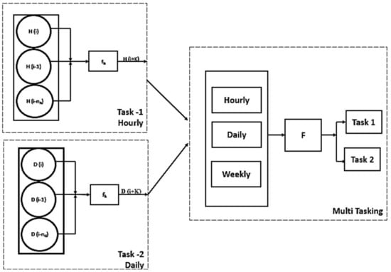 The single time scale model can perform better for that specific time scale but cannot be employed for other time scale forecasting. Moreover, the data consideration for single time scale forecasting is limited. In this work, a multi-time scale model for solar irradiance forecasting is proposed based on the multi-task learning algorithm. An effective resource sharing scheme between each task is presented. The proposed multi-task learning algorithm is implemented over an LSTM neural network model, and the performance is investigated for various time scale forecasting. The hyperparameter estimation of the proposed LSTM model is made by a hybrid chicken swarm optimizer based on a combination of the chicken swarm optimization algorithm (CSO) and grey wolf optimization (GWO) algorithm’s best features. To tune the LSTM model parameters, a hybrid swarm intelligence algorithm is developed based on combining the characteristics of CSO and GWO. The organization of the article is presented as follows: The methodology of the proposed multi-time scale irradiance forecasting is presented in Section 2. The proposed neural network architecture, the overview of the proposed hybrid optimization algorithms, is presented in detail. Section 3 illustrates the methodology’s experimental modelling, along with the obtained results and discussion, based on which the article is concluded in Section 4.