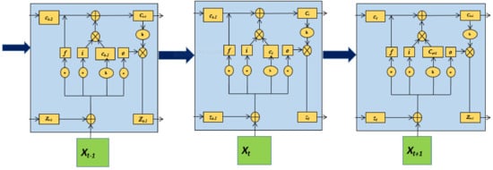 The long short-term memory network is a kind of recurrent neural network, and the LSTM architecture handles the vanishing gradient problem of classic RNN. During the training process, the data flow is maintained by switching special gates that decide when to read, write, and what data to be stored in the gates coordinately. The deep LSTM architecture is presented in Figure 5, with the input gate , output gate , the forget gate and the context unit . The signal flow between the layers with long term learning dependencies is presented below: